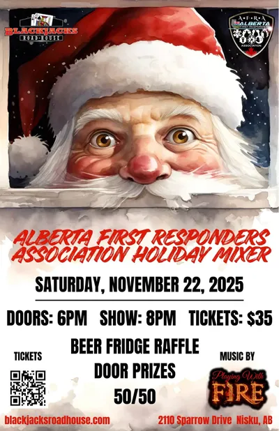 The Alberta First Responders Association (AFRA) invites all First Responders, their family, friends and supporters to our annual Holiday Mixer. Expect door prizes, live band, appetizer buffet and great company. All proceeds go to mental health support and suicide prevention programs for First Responders.